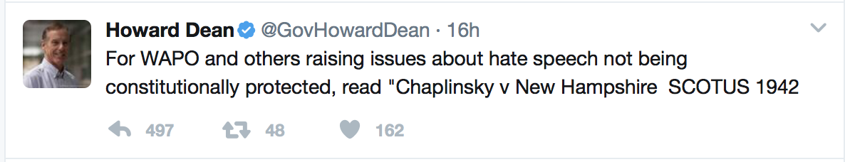 Dean doubled down, citing a 1942 case, Chaplinsky v. New Hampshire as supposed authority for the view that the First Amendment does not protect hate speech. Dean is clearly wrong about Chaplinsky, however.